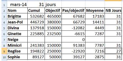 le 28/03 4380 pas le 29/03 8555 pas le 30/03 6376 pas le 31/03 5889 pas le 01/04 5889 pas le 02/04 5889 pas le 03/04 7948 pas le 04/04 5889 pas le 05/04 7250 pas le 06/04 6245 pas le 07/04 2138 pas (oublier mon podometre) |