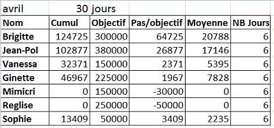 Voici le premier tableau d'Avril, merci de valider vos objectifs. Je n'ai pas commenté mars mais un grand bravo à Sophie qui a presque doublé son objectif de 50 000 pas avec de très belles journées à près de 10 000 pas. 13 h de ménage en une seule journée c'est énorme, il faut garder ton podomètre dans la maison, il enregistrera tes pas. Brigitte est la plus active avec plus de 17000 pas de moyenne et j'ai du mal à croire qu'elle restera sur un objectif de 10 000 pas. Mimi avec près de 7800 pas en moyenne peut essayer d'augmenter son objectif. Il a juste manqué 200 pas de plus par jour pour que Béa réalise son objectif, on peut considéré qu'il est atteint. Vanessa a du mal à faire ses 5000 pas par jour, il ne lui manque pas grand chose, il lui reste juste à sortir un peu plus le week-end et porfiter du soleil. Reglise n'a pas donné sa dernière semaine, elle avait peut-être rattrapé son retard. Quant à moi, je vais faire pas mal de jardinage ce mois-ci. Je vais essayer de garder une moyenne de plus de 12 500 pas par jour pour garder mon statut de très actif. |