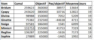 Mon podo ne donne pas vraisemblablement le bon nombre de pas, ce matin j'ai fait plus de 12 km dont 10 km de course, il m'a compté à peine 12 000 pas. Bon c'est pas grave je ferai avec, je ne fais pas de la compétition. J'ai quand même attein 21888 pas en fin de journée ce qui doit faire près de 20 km. Béa où es tu ? Je posterai le tableau de la semaine dernière demain à la fraiche, mais il me manque pas mal de résultats : |
